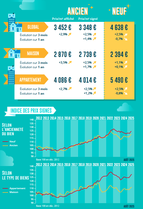 Ainsi, la hausse des prix constatée durant les 3 derniers mois témoigne de la vivacité du marché : avec des augmentations de 2.5 % pour les appartements et pour les maisons. Et en juillet 2025, les prix mesurés en niveau annuel glissant augmentaient de 1.4 % sur un an, sur l’ensemble du marché : il y a un an à la même époque, les prix étaient en recul de 3.7 %. L’augmentation reste la plus rapide sur le marché des maisons où la demande est toujours très forte : + 1.7 % sur un an, contre + 1.2 % pour les appartements.