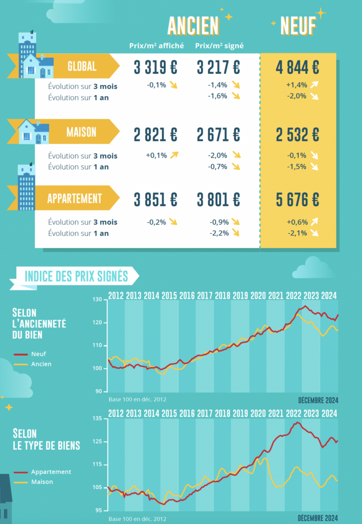 Pour autant, compte tenu du ralentissement de la baisse constatée jusqu’alors, le prix annuel moyen de l’ancien est revenu fin 2024 à son niveau de décembre 2021 ; voire à son niveau de l’été 2023 en trimestriel glissant !