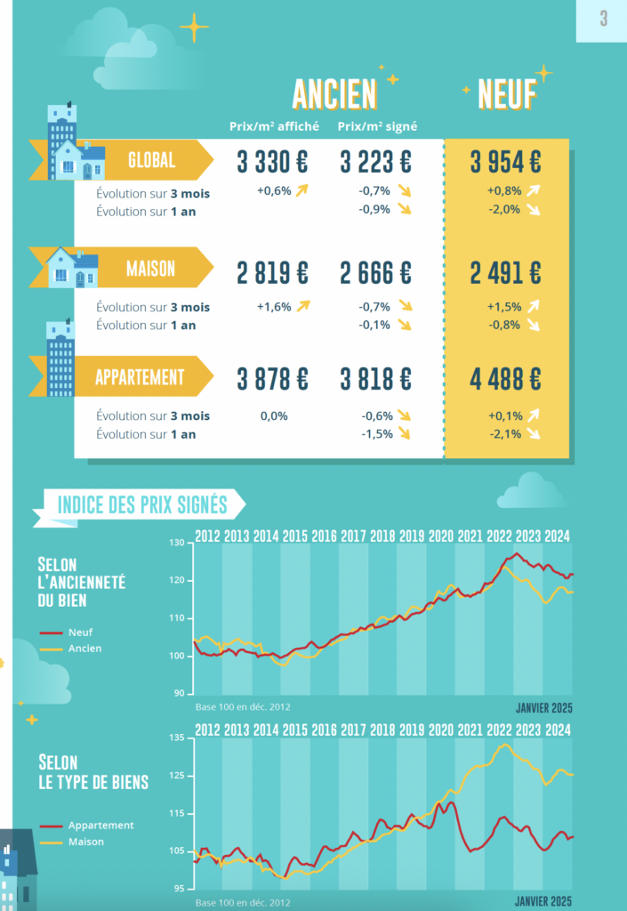 Le ralentissement de la baisse des prix signés est donc rapide : – 0.9 % pour l’ensemble du marché en 2024, contre – 3.1% en 2023 (et même – 4.6 % en avril 2024).