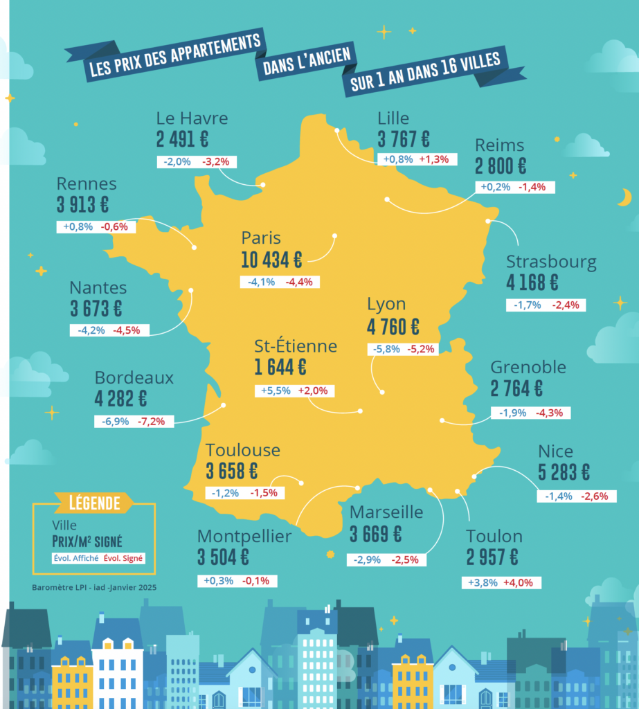 Et alors que durant le 1er semestre la remontée des prix était limitée à la Province, avec le redémarrage général du marché, l’Ile de France a commencé à bénéficier de la nouvelle donne. Ainsi en 2024, 16 % des villes franciliennes de plus de 40 000 habitants ont enregistré une hausse des prix : pour une augmentation moyenne de 2.4 %. La hausse la plus rapide se constate sur Meaux (+ 9.5 %), confirmant une évolution qui s’est renforcée durant l’été. Et elle se constate maintenant, bien qu’à un rythme encore moins soutenu, à Bobigny, Rueil-Malmaison ou Vincennes, par exemple ? Et partout en Ile de France, lorsque les prix reculent toujours, la baisse se fait de moins en moins rapide au fil des mois : le recul qui y était en moyenne de 6.3 % sur un an en juin dernier était de 4.4 % en décembre.