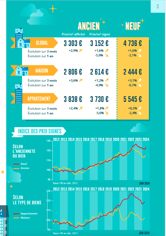 Dans les autres grandes villes, la baisse est intervenue dès la fin de l’été 2023, partant d’un point haut de la courbe des prix généralement situé à la fin du printemps. Mais depuis février dernier, la courbe des prix s’est inversée : et dans 70% des villes de plus de 100 000 habitants, les prix signés augmentent maintenant sur 3 mois (comme d’ailleurs les prix affichés, en réponse au relèvement des ambitions des vendeurs qui reviennent sur le marché).