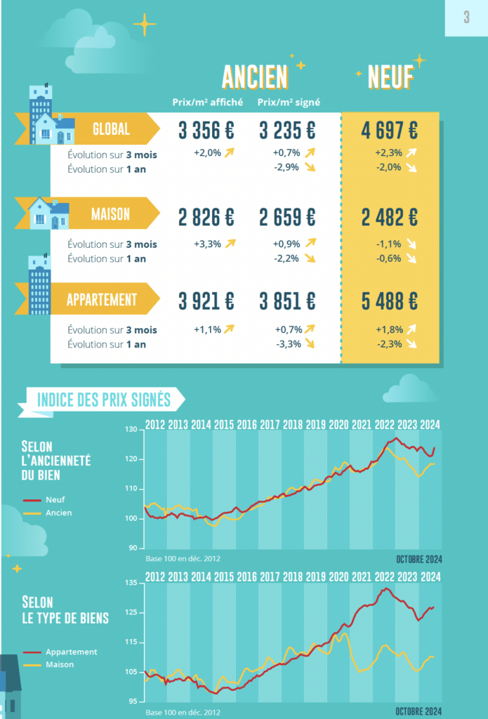 Mais bien que la courbe des prix se soit inversée, les prix signés restent orientés à la baisse en niveau annuel glissant. Le rythme de la baisse est désormais moins rapide, mois après mois : avec – 2.9 % pour l’ensemble du marché, contre – 4.6 % en avril et en mai. Cependant, il faudra attendre encore plusieurs mois (probablement le printemps 2025) pour qu’à son tour la courbe des prix mesurés en niveau annuel glissant se retourne.