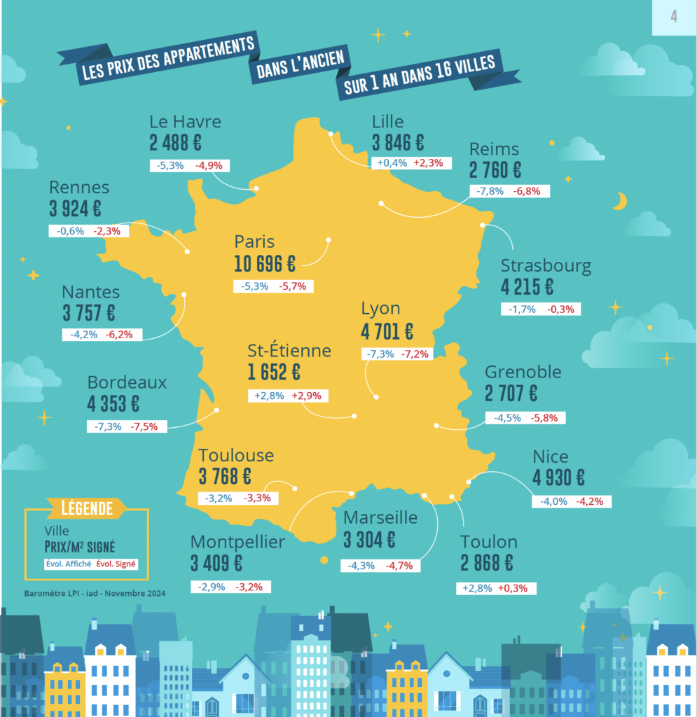 Durant l’été la hausse des prix s’est renforcée. Mais compte tenu du recul observé en 2023, en niveau annuel glissant les prix n’augmentent sur un an que dans 38 % des villes de Province de plus de 40 000 habitants (contre 35 % en août et 23 % en juin) : la hausse est alors de 5.9 % en moyenne. Et elle concerne désormais des grandes villes (plus de 100 000 habitants) telles Amiens, Dijon, Lille, Limoges, Metz et Saint-Etienne. D’autres grandes villes basculant bientôt dans le champ des hausses de prix : comme Besançon ou Strasbourg.
