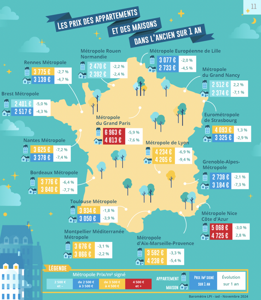 En ce qui concerne le marché des maisons, les prix n’augmentent que sur la Métropole de Nice-Côte d’Azur : alors que les prix reculent toujours dans la ville-centre, la pression de la demande en périphérie et une décote élevée (près de 25 %) y soutiennent une progression sensible des prix. En revanche, les prix reculent dans les autres métropoles, à des rythmes parfois rapides (Bordeaux, Grenoble, Lyon, Nantes, Nancy et Paris) : en dépit d’une préférence de la demande pour la maison individuelle toujours vive, les difficultés d’accès au crédit pèsent sur les capacités d’achat des ménages.